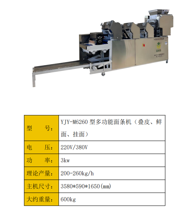 益加益集團研發(fā)生產(chǎn)的YJY-M系列面條機,是將傳統(tǒng)模式和現(xiàn)代工藝相結(jié)合,經(jīng)多次技術(shù)升級后推出的最新一代多功能自動面條機,整機外觀精美、結(jié)構(gòu)先進,操作方便,安全耐用,噪音低,效率高,省時省工。操作時只需將拌好的面放入機器,通過多道壓面輥自動搟面,一次性成型面條。系列產(chǎn)品只需通過更換不同刀具可以生產(chǎn):方形面條、圓形面條、刀削面、菱形面、掛面、餃子皮、熱干面、混沌皮等;廣泛適用于賓館、飯店、機關(guān)、學校等單位食堂,食品加工廠及個體生產(chǎn)銷售面食之用;我公司也可訂為客戶定制大型面條機。